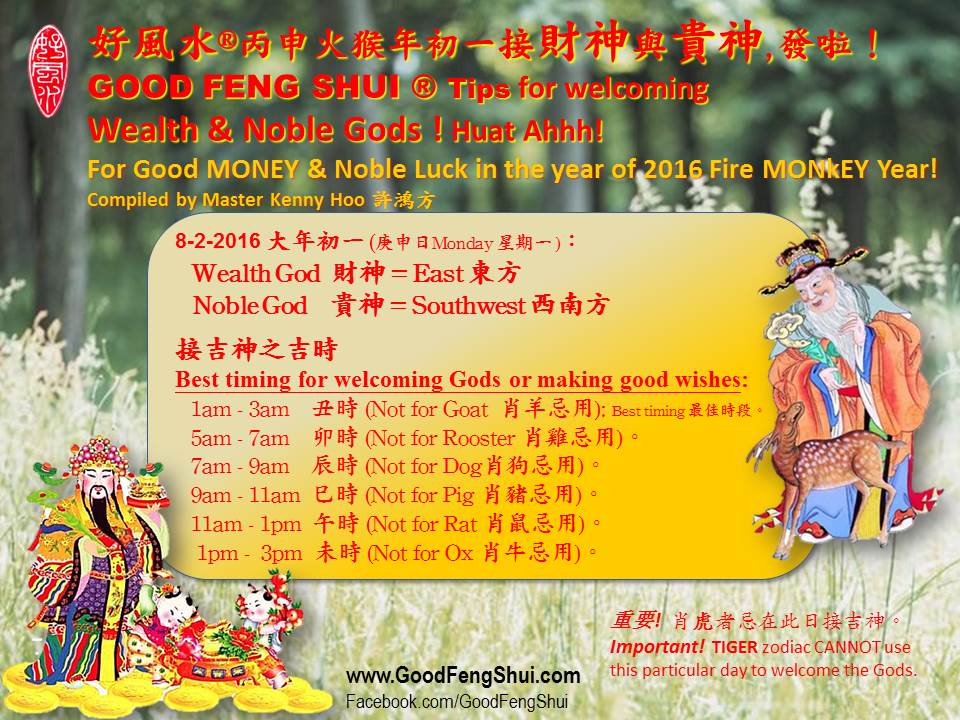 2016 火猴年新春接财神贵神吉时日 Auspicious date and time for welcoming Wealth and Noble Gods in CNY