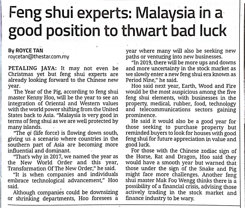 Hoo said next year, Earth, Wood and Fire would be the most auspicious among the five feng shui elements, with businesses in the property, medical, rubber, food, technology and telecommunications sectors gaining prominence.
